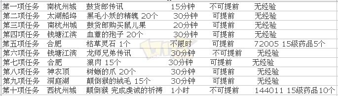 第一项任务 西杭州城 颠倒猴 1小时20分 不可提前 无经验 第二项任务 洞庭湖 山神祭拜处 20分 不可提前 26320 尘缘+10 还神丹2个