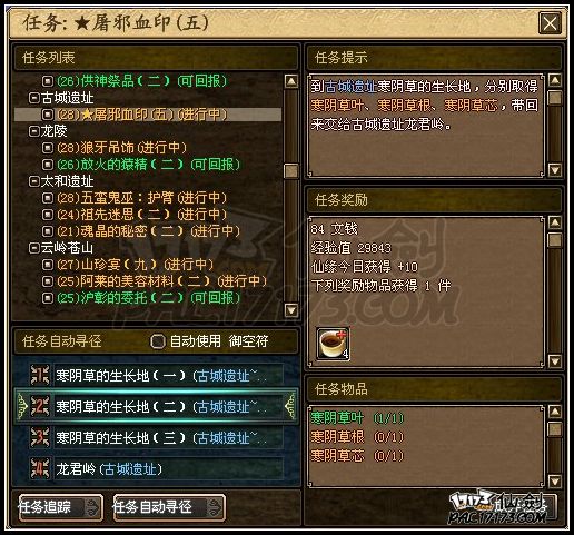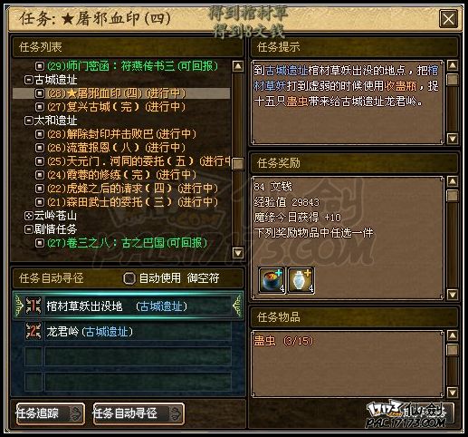 四.打倒棺材草,收15只蛊虫.一样是用任务道具捉虫.很简单.这里要注意的是,打倒棺材草妖会掉 棺材草,注意保存.最好收集30份.做29级天女任务用得着,