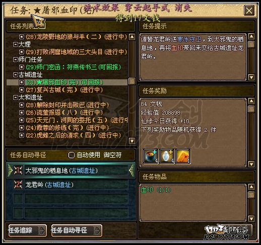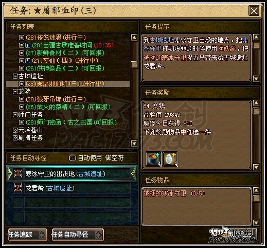 在这里请第一次进古城做任务的朋友们注意哈,古城里的怪是一直会刷新的.而且全是主动怪.比如说,你打死一个怪,这个怪会在55秒到1分钟之间再次刷出来,在古城做任务唯一麻烦的是要在几种怪里来回穿梭.注意在任务来回走动时,请一路将怪清了,或用符飞.最好别让几个怪追着你打,那样怪越集越多,你容易挂的.还请大家多留心.至于宝图碎片 .我还没集齐5张,到时齐了看做任务能得到什么.我会及时告诉大家的.
