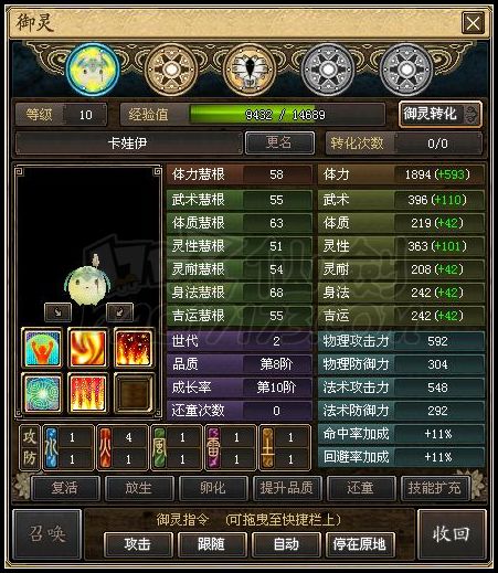恩。。然后就是,这次转化完之后。宝宝的成长阶是完全随机的。但至少都是4代以上,看个人人品了。我运气还好,一次就到10阶满阶了。我朋友的是8,有人会问那有没有什么办法把成长阶级提高起来?目前除了转化之外就只有还童,但是一旦还童。。。。宝宝7属性又是完全随机 -。- 所以。。有想要转化御灵的同学需要考虑清楚了。。。或许你可以试试直接用还童F洗出一个极品的来,但是几率,微呼其微,而且还童洗的成长最高只有8阶。品质依然是0,需要自己买鞠心蛊提升。
