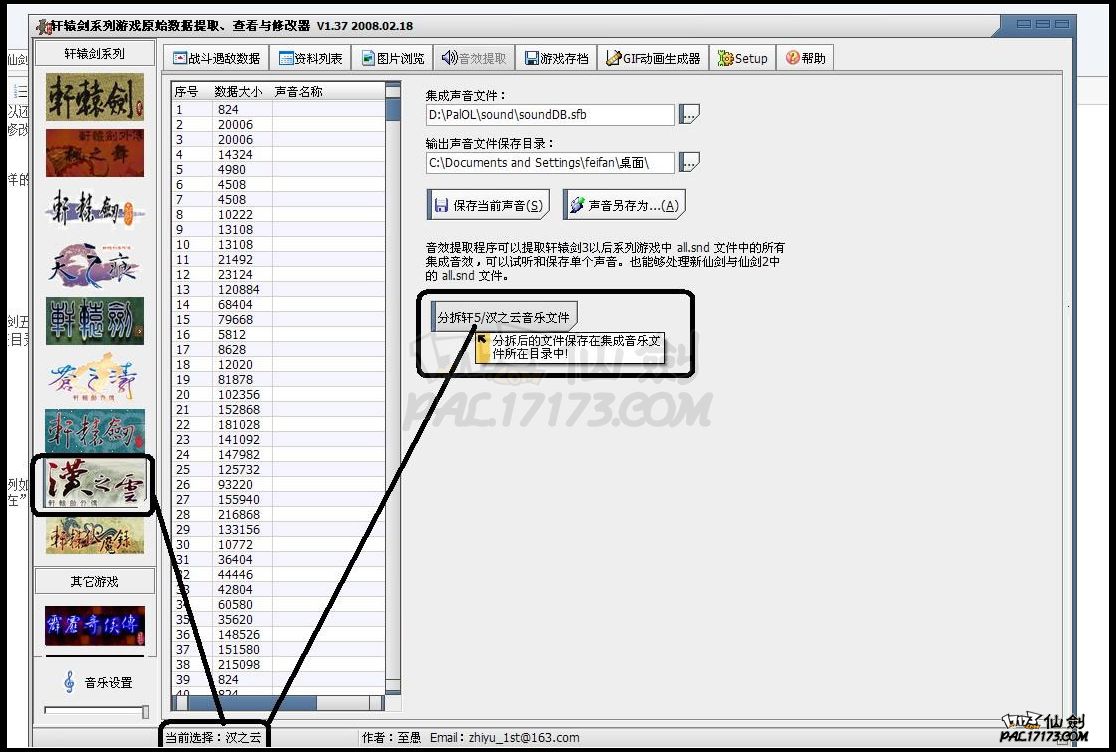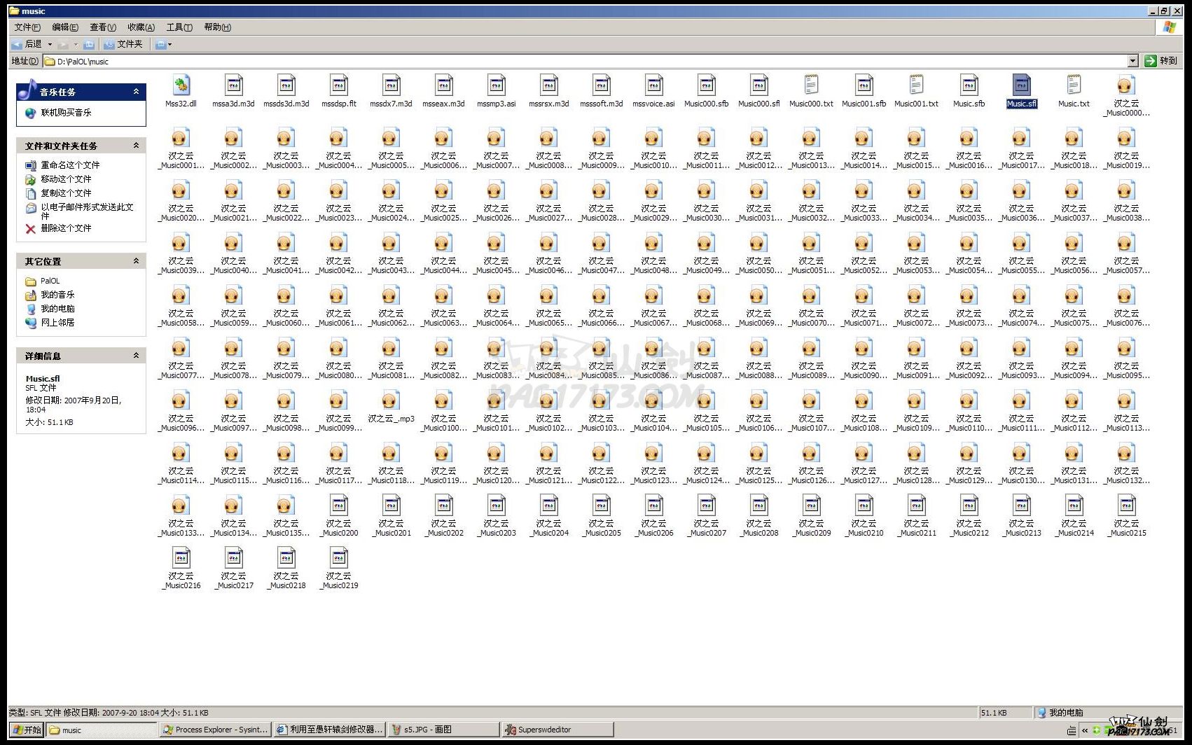 6.浏览到仙剑OL安装文件夹,改Music.sfb/sfl为Music.sfbv/sflv,将Music000.sfb/sfl改名为Music.sfb/sfl(备份原文件!!!),再次点击“分拆……”,之后恢复Music.sfb/sfl为Music001.sfb/sfl,然后更改Music001.txt为Music.sfl,改Music001.sfb为Music.sfb,再次点击“分拆……”,再改Music.sfl为Music001.txt,改Music.sfb为Music001.sfb,改Music.sfbv/sflv为Music.sfb/sfl。