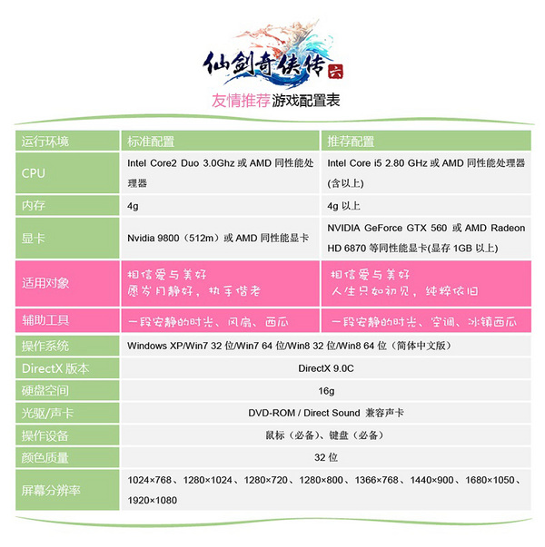 仙剑六配置要求,什么配置能玩仙剑六,电脑跑的动仙剑六吗?《仙剑六》最低配置是什么?《仙剑6》推荐配置是什么