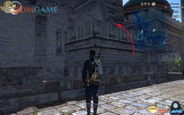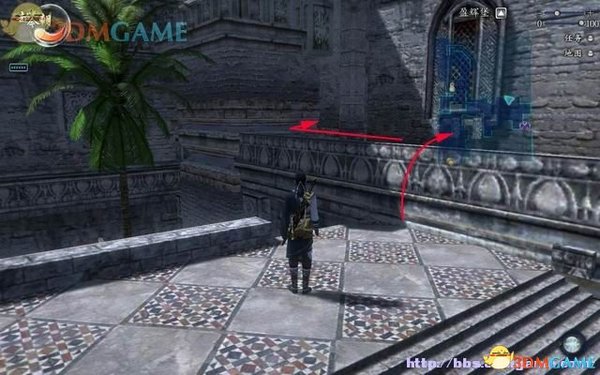 由平台往一侧的建筑边沿上跳,再沿着它顺时针绕过去,就能看到牌坊和探索点了。