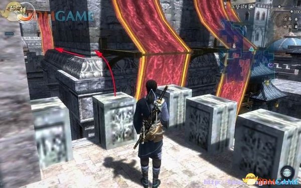 这个探索点有难度,它在图示的牌坊檐脊上。首先沿着右边的楼梯上去。