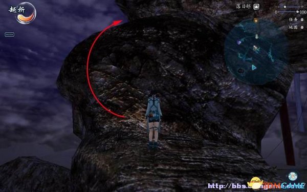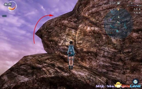 面对那道高崖的巨石,由帐篷边缘朝石壁的突台上跳,沿着斜面顺时针方向绕过去,注意要按住W键贴紧石壁,再不停的跳跃来保持不滑下去。