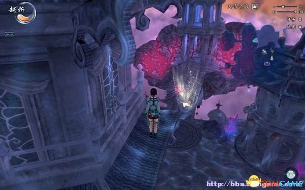 或者找个平台边缘跳到虚空里自杀,角色会重生在特定的天桥上面,望一侧看那只亭子就在附近。