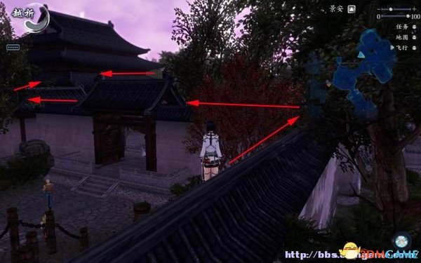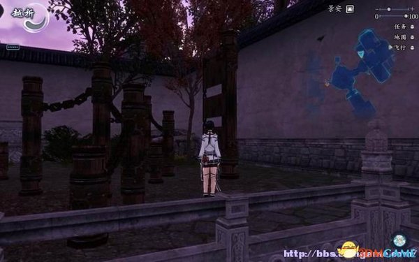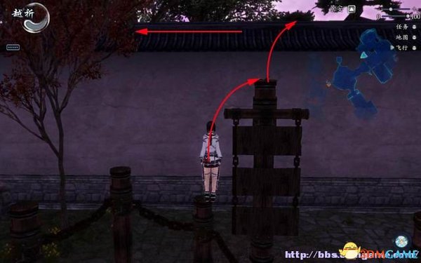 笔者找到一条路线是跑到如图的练武场,这里有很多的木桩,可用来跳上围墙。