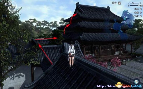 沿着围墙朝大殿方向走过去,其间有几处屋檐需要上跳。